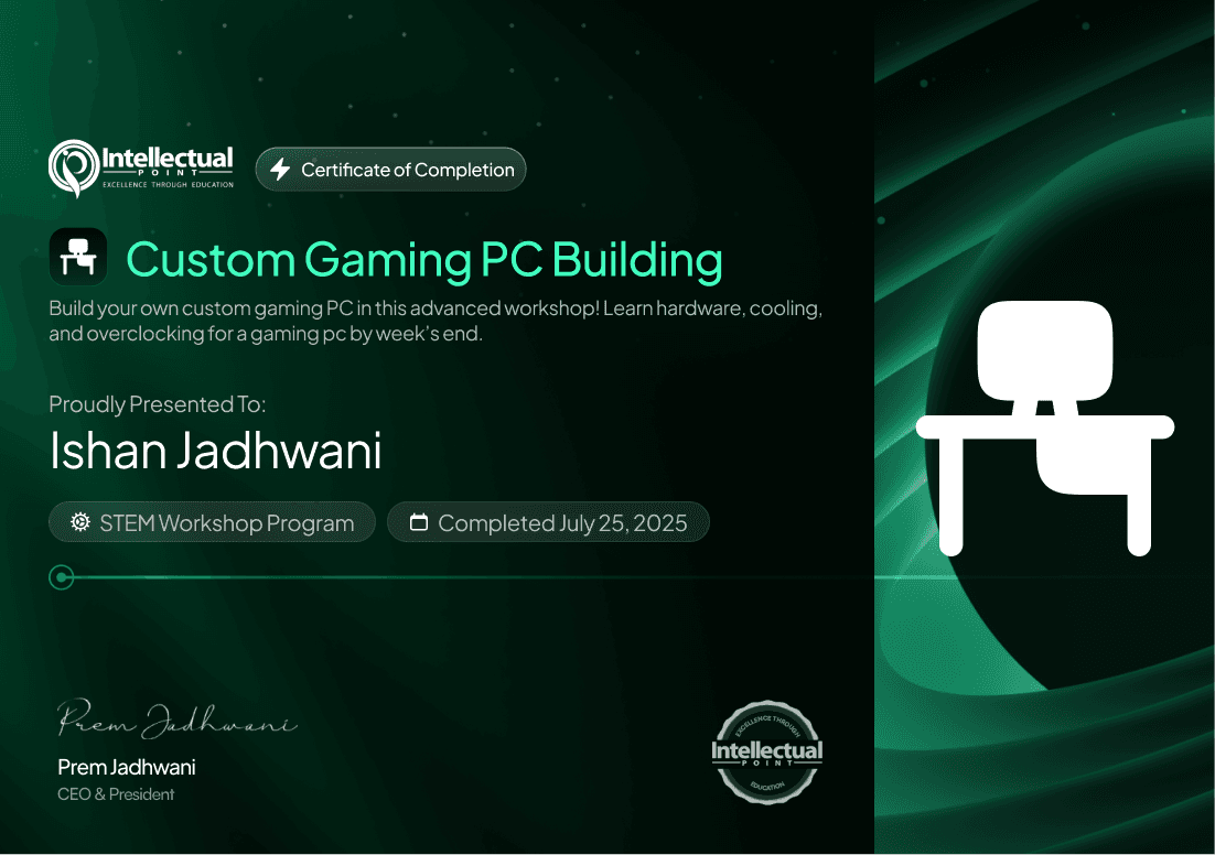 *Recommendation: Have adult supervision on standby if assembly of tiny parts cannot be done unassisted. Unleash your gaming potential by building your very own custom gaming PC! In this week-long workshop, you'll learn about hardware, cooling, and overclocking, and get to assemble your own powerful rig. By the end, you’ll own a high-performance gaming PC that you built yourself, ready to game or even stream!